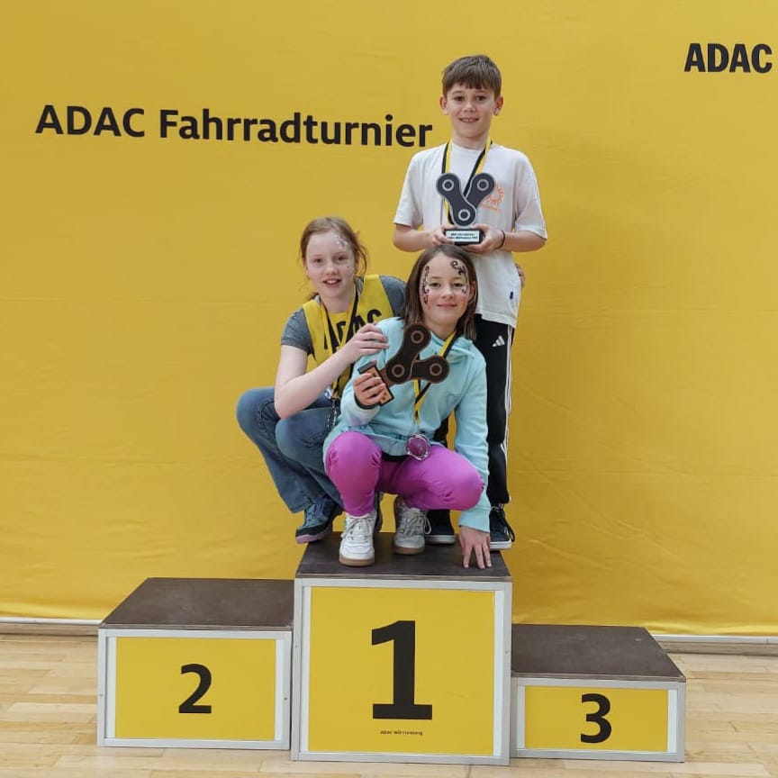 Wir gratulieren Samuel zu Platz 2, Lena zu Platz 3 und Nora zu Platz 9 bei der baden-württembergischen Meisterschaft. Insgesamt traten beim Landesfinale des ADAC-Fahrradturniers in Rheinstetten 90 Kinder und Jugendliche an. Auf dem 200 Meter langen Parcours waren Konzentration, Geschicklichkeit und ein fehlerfreier Durchgang gefragt. Die besten Jungen und Mädchen hatten sich im vergangenen Jahr gegen rund 7000 Teilnehmende bei den Schulturnieren sowie den Landesturnieren in Nordbaden, Südbaden und Württemberg durchgesetzt und für das große Finale qualifiziert.